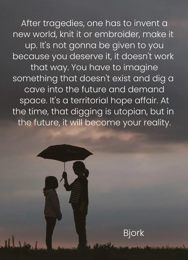 «Μετά από τραγωδίες, πρέπει να εφεύρεις έναν καινούριο κόσμο, να τον πλέξεις ή να τον κεντήσεις, να τον «υφάνεις» με τη φαντασία σου. Δεν πρόκειται να σου δοθεί επειδή πιστεύεις ότι το αξίζεις. Δεν λειτουργεί έτσι. Πρέπει να φανταστείς κάτι που δεν υπάρχει και να σκάψεις μια «σπηλιά» στο μέλλον, διεκδικώντας τον χώρο σου. Είναι ζήτημα εδαφικής ελπίδας. Εκείνη τη στιγμή, αυτό το σκάψιμο φαίνεται ουτοπικό, αλλά στο μέλλον θα γίνει η δική σου πραγματικότητα.»